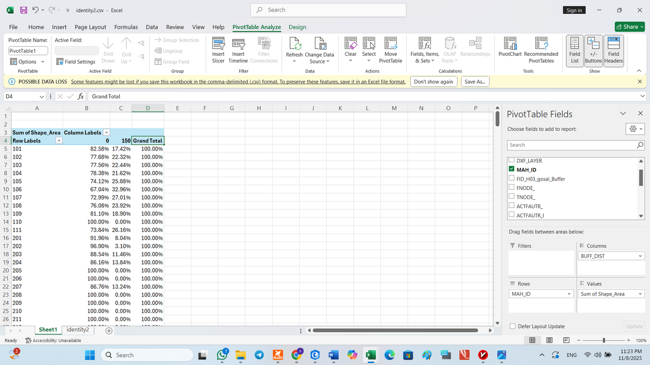 و سپس آن را در اکسل باز می کنیم. حال در اکسل روی pivot table کلیک می کنیم. mah id را در rows وارد می کنیم. buff distance را در columns وارد می کنیم و در values sum of shape area را وارد می کنیم حال در field settings پنجره ای باز می شود در تب اول sum را رناختب می کنیم و در تب دوم shoe values as percent of total rows انتخاب کرده و اوکی را می زنیم اینگونه یم جدول با اطلاات مفید و خلاصه از جمعیت برای ما ایجاد می شود