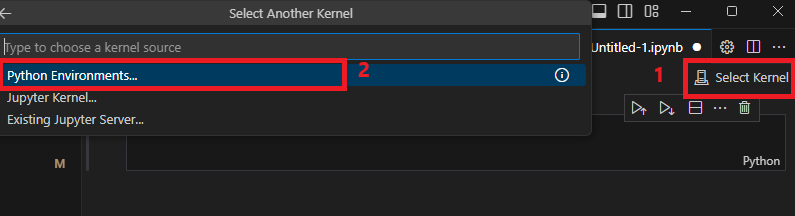 e. بعد از باز شدن صفحه Jupyter Notebook گزینه Select Kernel را زده و از Existing Python Environment محیط مجازی ساخته شده در مرحله قبل را انتخاب کنید.